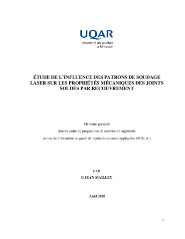 Mailley, Jean (2020). Étude de l'influence des patrons de soudage laser sur les propriétés mécaniques des joints soudés par recouvrement. Mémoire. Rimouski, Université du Québec à Rimouski, Département de mathématiques, informatique et génie, 143 p.