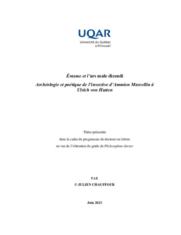 Chauffour, Julien (2023). Érasme et l'ars male dicendi : archéologie et poétique de l'invective d'Ammien Marcellin à Ulrich von Hutten. Thèse. Rimouski, Université du Québec à Rimouski, Département de lettres et humanités, 402 p.