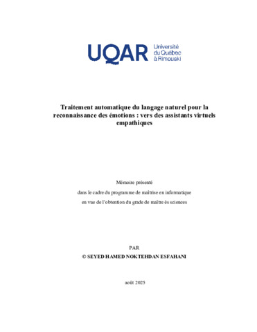 Noktehdan Esfahani, Seyed Hamed (2025). Traitement automatique du langage naturel pour la reconnaissance des émotions : vers des assistants virtuels empathiques. Mémoire. Rimouski, Université du Québec à Rimouski, Département de mathématiques, informatique et génie, 45 p.