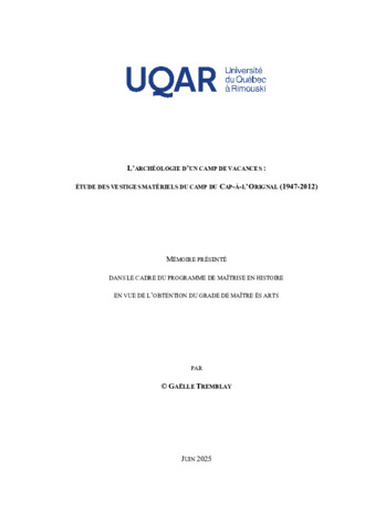Tremblay, Gaëlle (2025). L'archéologie d'un camp de vacances: étude des restes matériels du camp du Cap-à-l'Orignal (1947-2012). Mémoire. Rimouski, Université du Québec à Rimouski, Département de lettres et humanités, 295 p.
