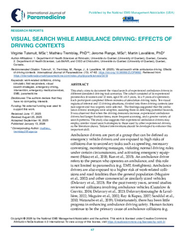 This study aims to document the visual search of experienced ambulance drivers in different simulated driving task scenarios. The cohort consisted of 16 experienced paramedics (4 women and 12 men, aged 38 ± 8.3 years, 16 ± 9 years of experience). Each participant completed fifteen minutes of simulation driving tasks. Ten visual regions of interest and 12 driving situations, divided into three driving contexts (one non-urgent and two urgent), were selected. The findings suggested that the ambulance drivers' strategies were adaptive, assisting them in detecting potential hazards. It was observed that when the driving demands increase, experienced ambulance drivers had longer fixation times, more frequent scanning, and a greater variety of search patterns. The study also suggests that experienced ambulance drivers may employ similar visual search strategies to those used by other experienced drivers, as the literature shows. Tailored interventions should be developed to enhance this important skill.