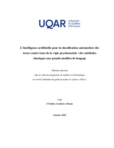 Adnane, Fatima Azzahrae (2025). L'intelligence artificielle pour la classification automatisée des textes courts issus de la vigie psychosociale : des méthodes classiques aux grands modèles de langage. Mémoire. Rimouski, Université du Québec à Rimouski, Département de mathématiques, informatique et génie, 89 p.