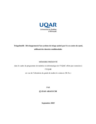 Araouchi, Ziad (2025). TriageIntelli : développement d'un système de triage assisté par IA en centre de santé, utilisant des données multimodales. Mémoire. Rimouski, Université du Québec à Rimouski, Département de mathématiques, informatique et génie, 36 p.