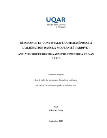 Casey, Rachel (2025). Résonance et convivialité comme réponse à l'aliénation dans la modernité tardive : analyse croisée des travaux d'Hartmut Rosa et Ivan Illich. Mémoire. Rimouski, Université du Québec à Rimouski, Département de lettres et humanités, 119 p.
