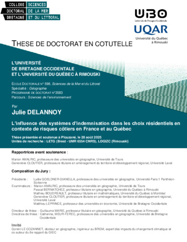 Delannoy, Julie (2025). L'influence des systèmes d'indemnisation dans les choix résidentiels en contexte de risques côtiers en France et au Québec. Thèse. [Rimouski, Québec][Brest], Université du Québec à RimouskiUniversité de Bretagne occidentale, Département de biologie, chimie et géographie, 422 p.