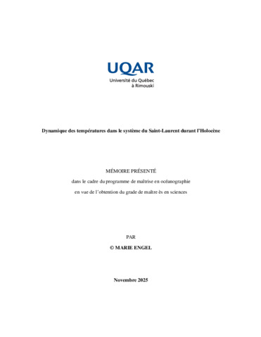 Engel, Marie (2025). Dynamique des températures dans le système du Saint-Laurent durant l'Holocène. Mémoire. Rimouski, Université du Québec à Rimouski, Institut des sciences de la mer de Rimouski (ISMER), 74 p.