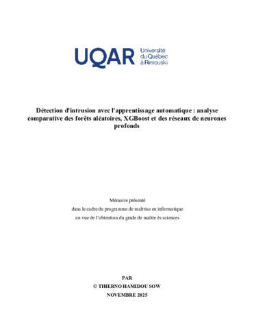 Sow, Thierno Hamidou (2025). Détection d'intrusion avec l'apprentissage automatique : analyse comparative des forêts aléatoires, XGBoost et des réseaux de neurones profonds. Mémoire. Rimouski, Université du Québec à Rimouski, Département de mathématiques, informatique et génie, 48 p.