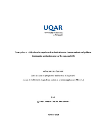 Mhadhbi, Mohamed Amine (2025). Conception et réalisation d'un système de robotisation des chaises roulantes régulières : commande semi-autonome par les signaux EEG. Mémoire. Rimouski, Université du Québec à Rimouski, Département de mathématiques, informatique et génie, 87 p.