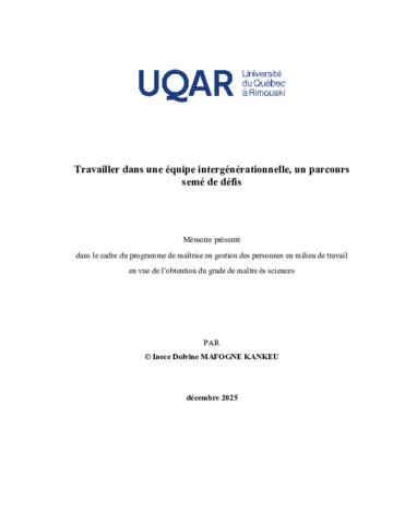 Mafogne Kankeu, Inece Dolvine (2025). Travailler dans une équipe intergénérationnelle, un parcours semé de défis. Mémoire. Rimouski, Université du Québec à Rimouski, Unités départementales des sciences de la gestion, 80 p.