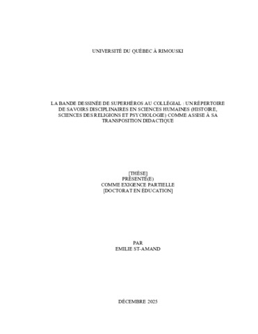 St-Amand, Emilie (2025). La bande dessinée de superhéros au collégial : un répertoire de savoirs disciplinaires en sciences humaines (histoire, sciences des religions et psychologie) comme assise à sa transposition didactique. Thèse. Rimouski, Université du Québec à Rimouski, Unités départementales des sciences de l'éducation, 587 p.