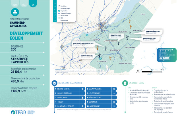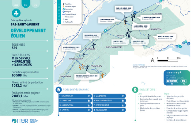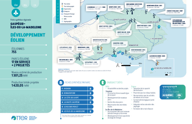 Observatoire des trajectoires territoriales et régionales (2026). Synthèse cartographique de la filière éolienne au Québec (Canada). 1. Région Gaspésie-Îles-de-la-Madeleine, 2. Région Bas-Saint-Laurent, 3. Région Chaudière-Appalaches. [Infographie]